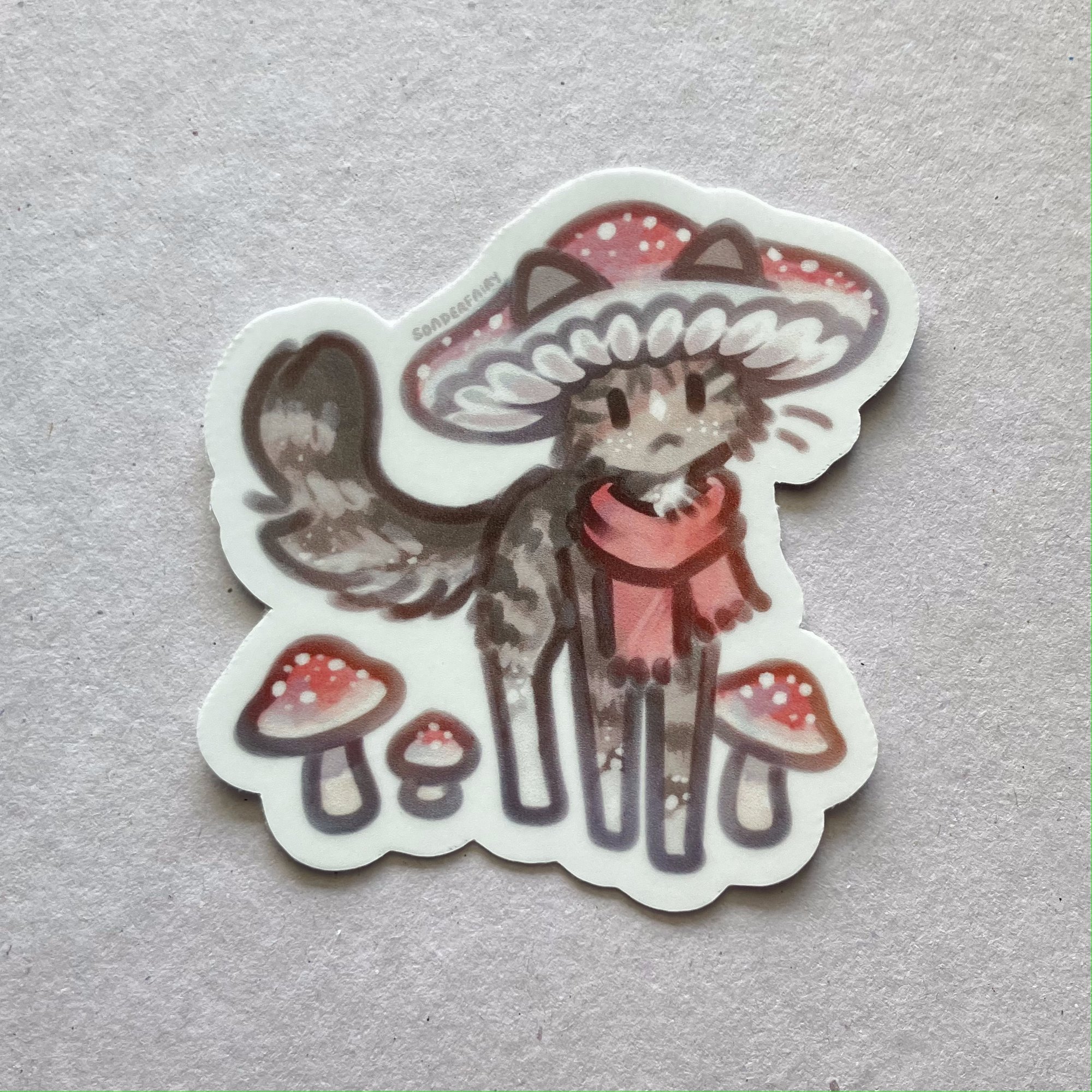 A cozy mushroom kitty to stick on your laptop, water bottle, or wherever you want.